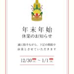 - 年末年始の休業についていつもご愛顧を賜りありがとうございます。年末年始は下記のとおり休業いたします。ご不便をおかけして申し訳ございませんが、何卒ご了承のほどお願いいたします。 休業期間:2025年12月30日(火)~2026年1月1日(木) […]
