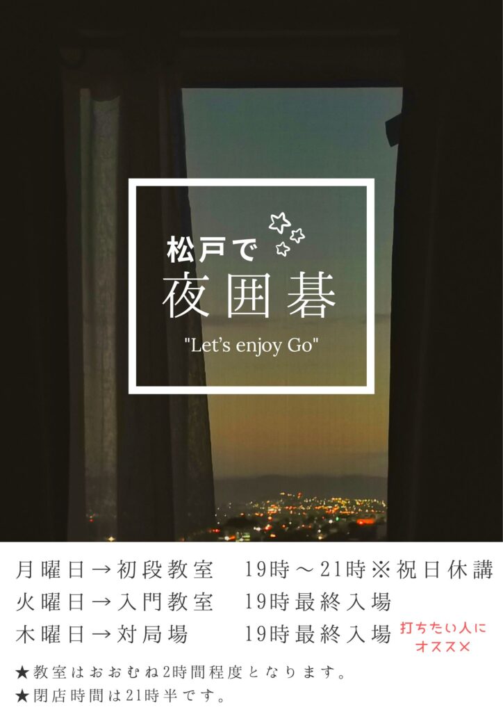 "夜囲碁"へのご参加が増えています! 2025年11月10日 最終更新日時 : 2025年11月10日 matsudoigo-salon日中はお忙しい大人ための"夜囲碁"に参加してくださる方が増えています!新しい趣味をお探しの大人の方、もっと囲碁を打ちたい方…さまざまなご要望にお応えすべく、各種教室および対局場を開いています。月曜日:初段教室(祝日は休講します)火曜日:入門・級位者教室木曜日:対局場教室はおおむね2時間です。21時半まで(最終入場は19時です)