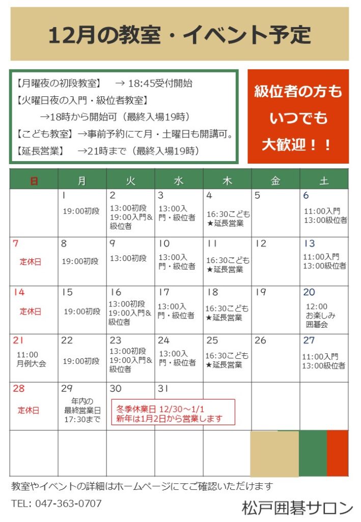 12月のスケジュール 2025年12月2日 最終更新日時 : 2025年12月2日 matsudoigo-salon12月のスケジュールです!今年もいよいよ終わりが見えてきましたね。お忙しい時期かとは思いますが、よろしければぜひ遊びにいらしてください!