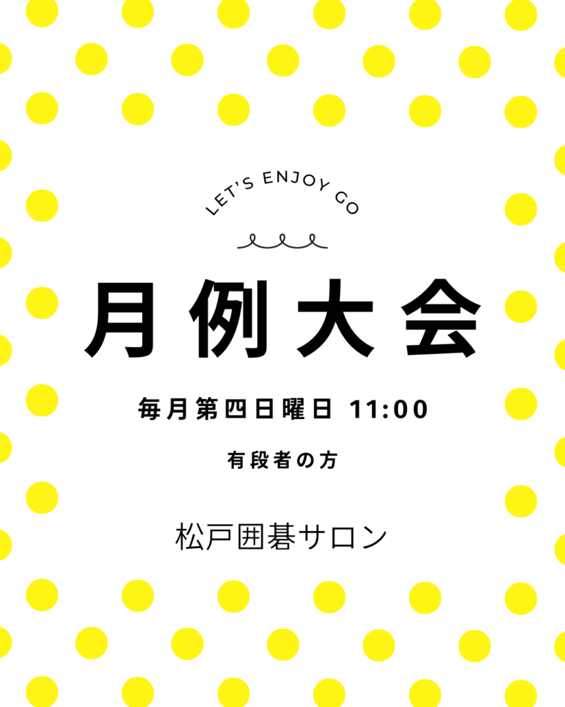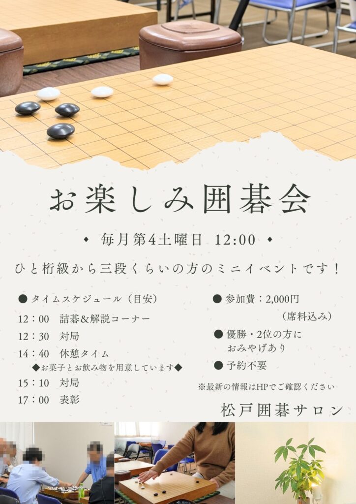内容: 対局(3~4局)、詰碁&解説コーナー、お茶とお菓子で休憩タイム
